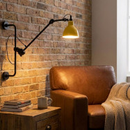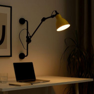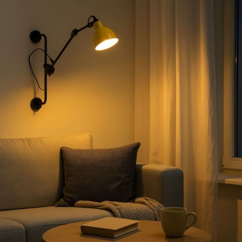 - Formato articulado: Possui uma estrutura fixa para fixação na parede e um braço articulado com três pontos de regulação que permitem inclinar as peças e o abajur. A parte mais longa pode ser girada em 360°.