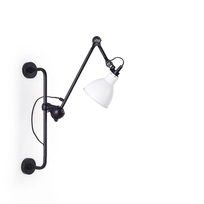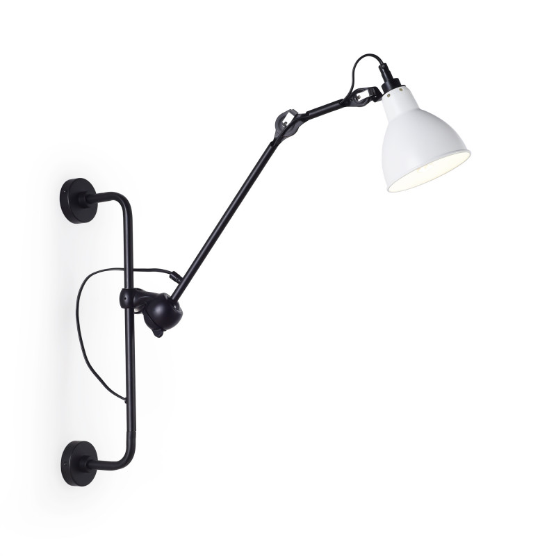 - Formato articulado: Possui uma estrutura fixa para fixação na parede e um braço articulado com três pontos de regulação que permitem inclinar as peças e o abajur. A parte mais longa pode ser girada em 360°.
