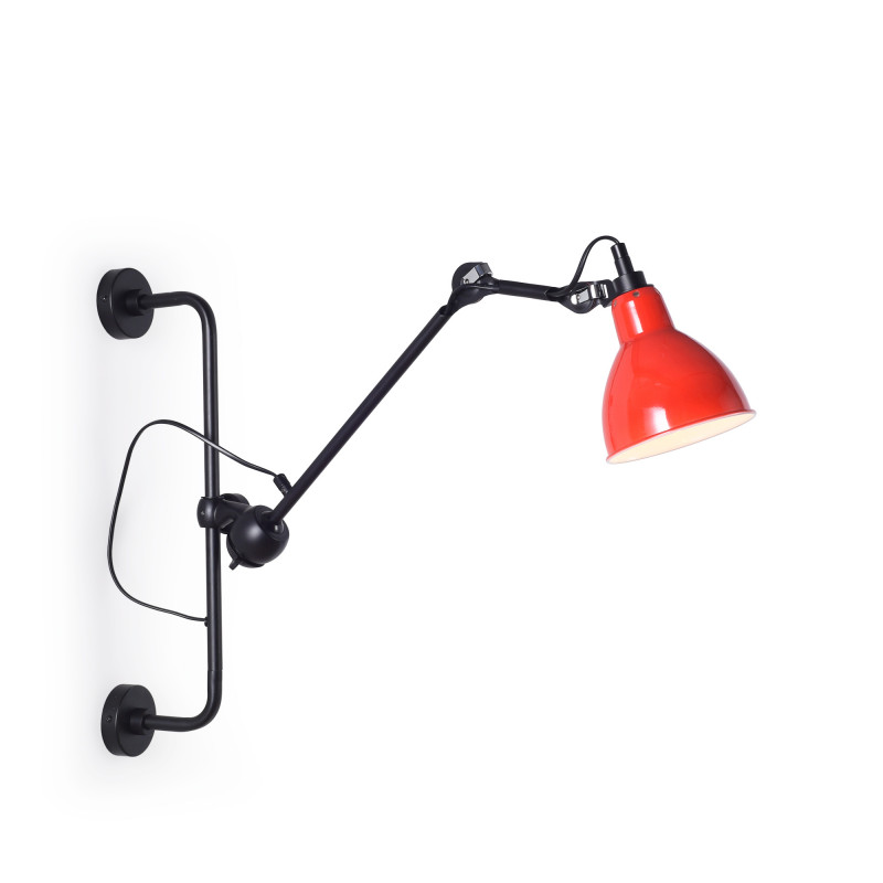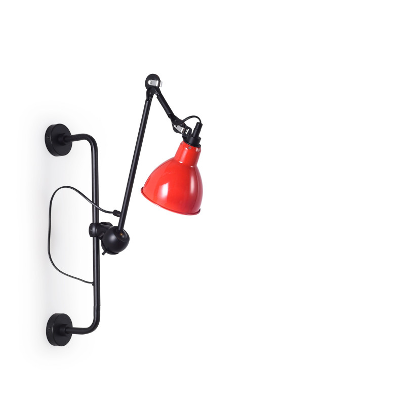 - Formato articulado: Possui uma estrutura fixa para fixação na parede e um braço articulado com três pontos de regulação que permitem inclinar as peças e o abajur. A parte mais longa pode ser girada em 360°.