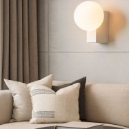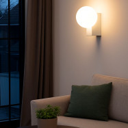 - Design minimalista: Composto por uma esfera de vidro opalino sobre uma base de alumínio, adapta-se perfeitamente a interiores clássicos, retro ou modernos.