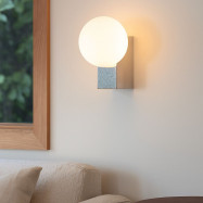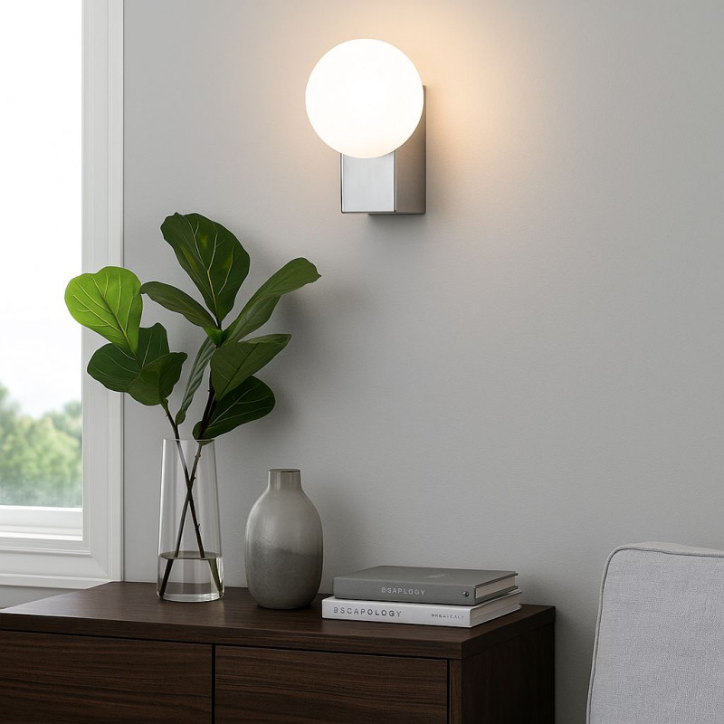 Candeeiro de parede "SIDERAL" com um design elegante e minimalista, composto por uma esfera de vidro opalino e uma base de alumínio.