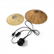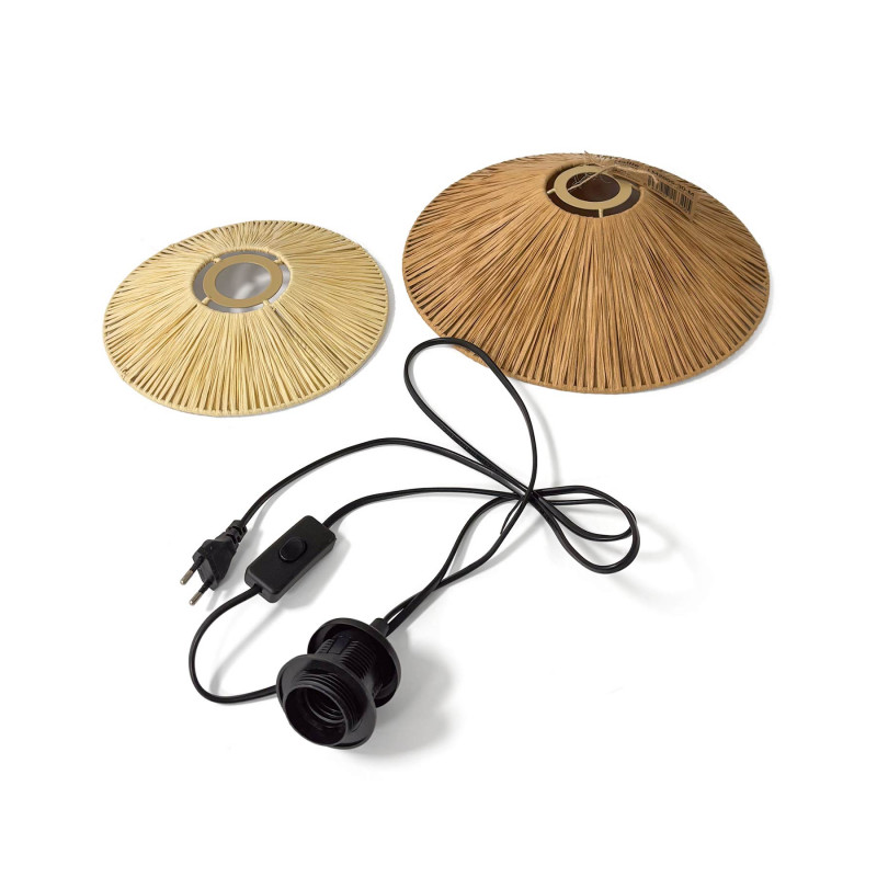 O seu abajur circular duplo, feito de fibra natural de Rafia, projecta uma luz suave, gerando um jogo de sombras decorativo e acolhedor.