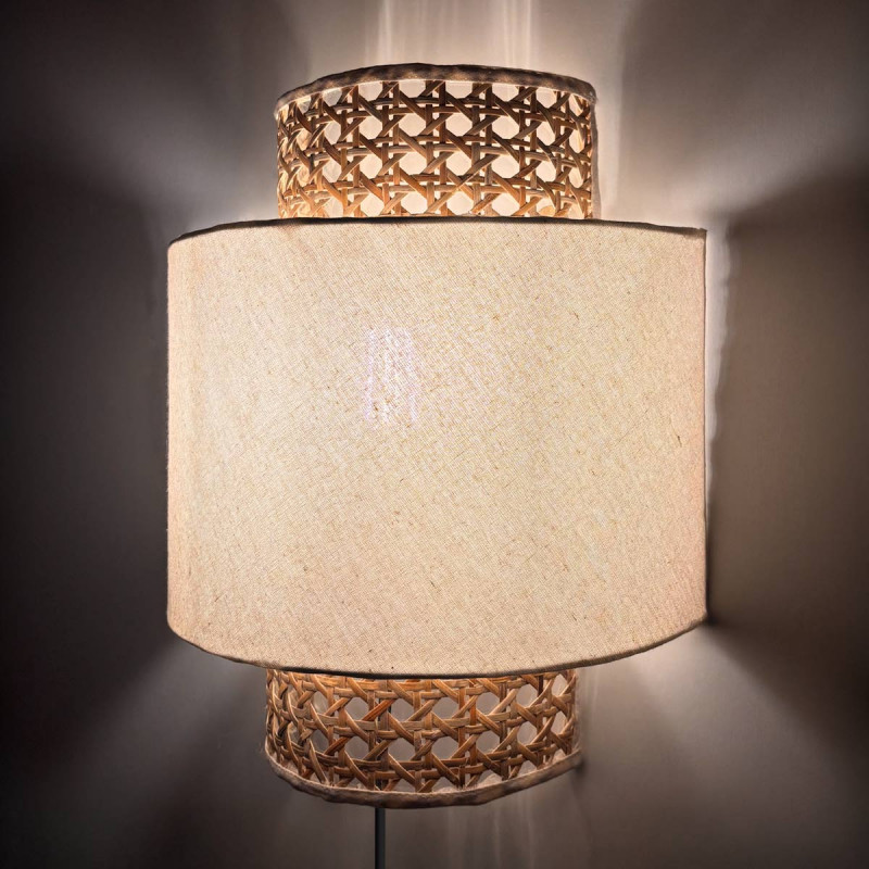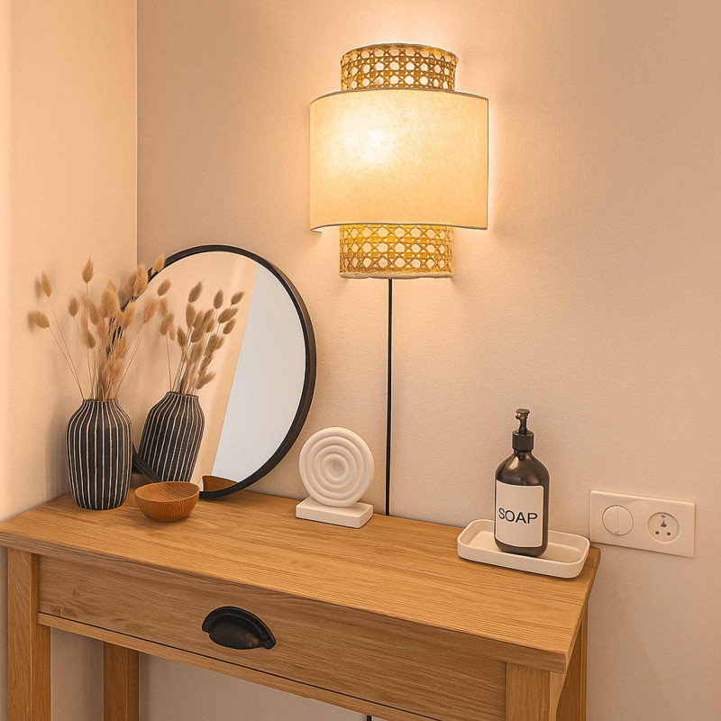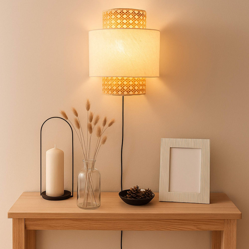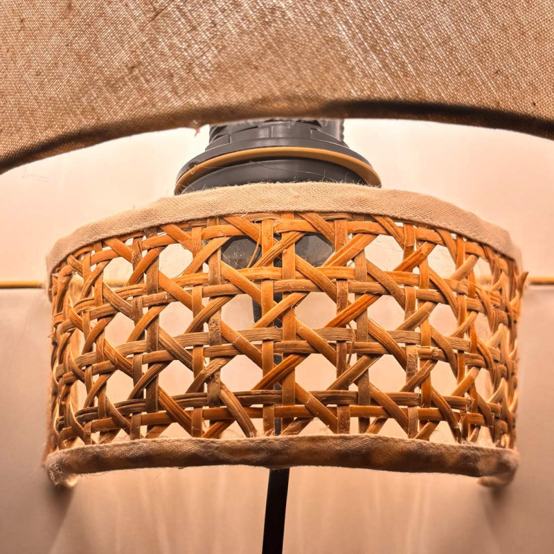 - Iluminação decorativa: O abajur de vime e tecido permite que a luz seja filtrada de forma quente e uniforme, criando um ambiente acolhedor.
