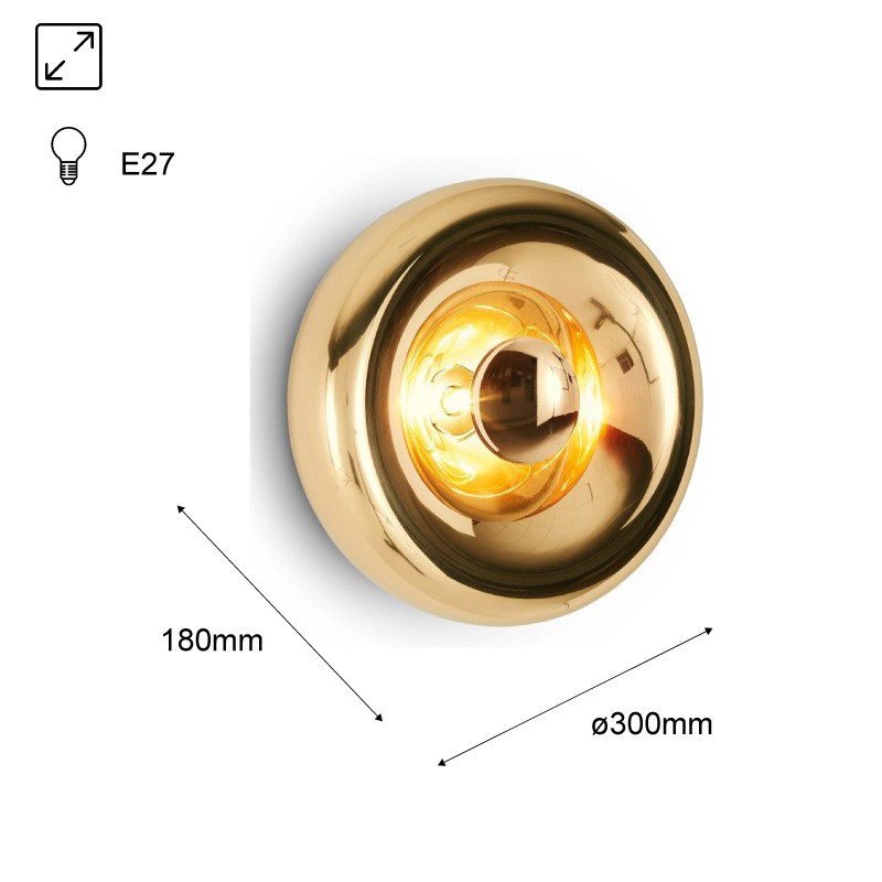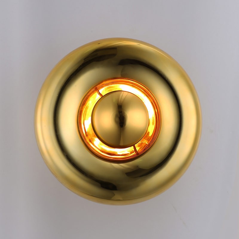 Aplique de parede com design vanguardista composto por um abajur hemisférico com acabamentos altamente brilhantes, garantindo um estilo único e sofisticado.