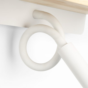 Tem uma base em alumínio lacado a branco, um elegante abajur em tecido bege e uma prateleira em madeira natural.