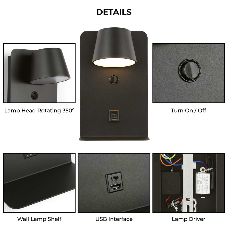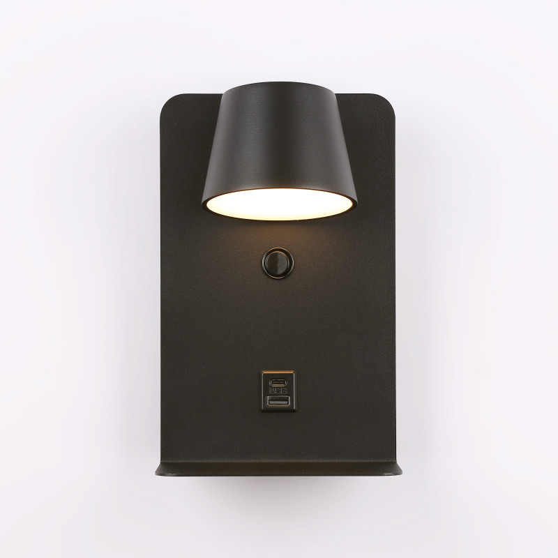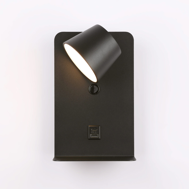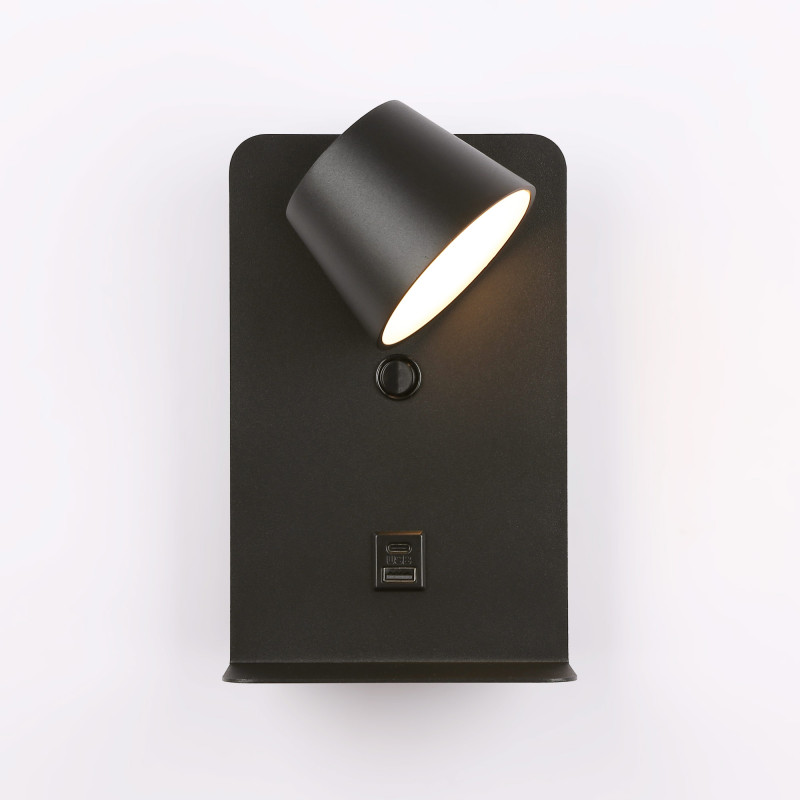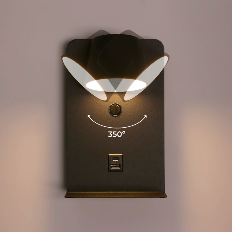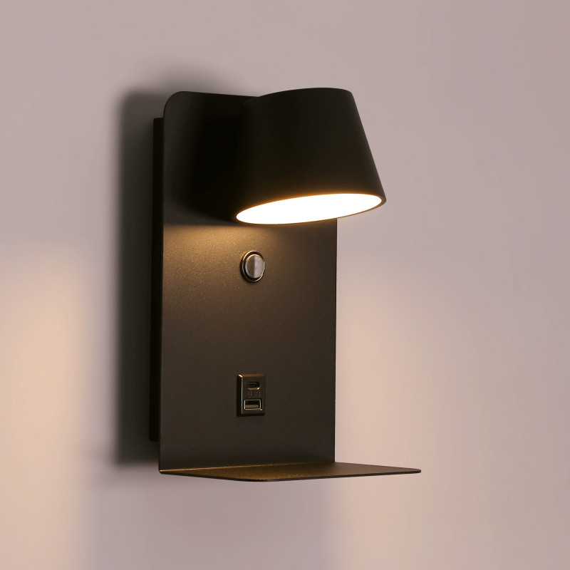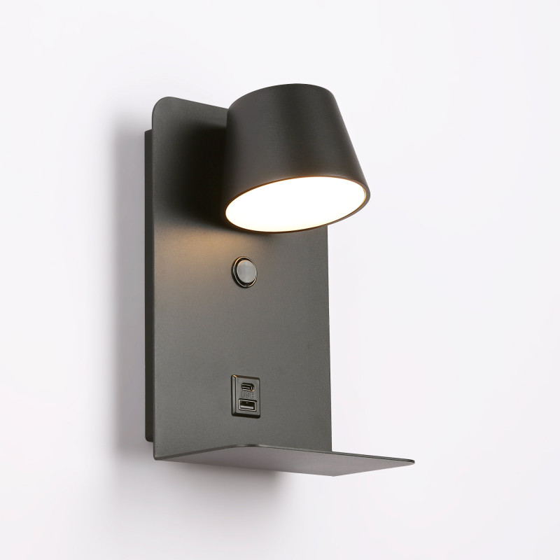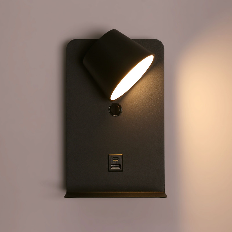 Candeeiro de parede de estilo nórdico, concebido para ser instalado em cabeceiras de cama, com porta USB, USB-C e prateleira integrada.