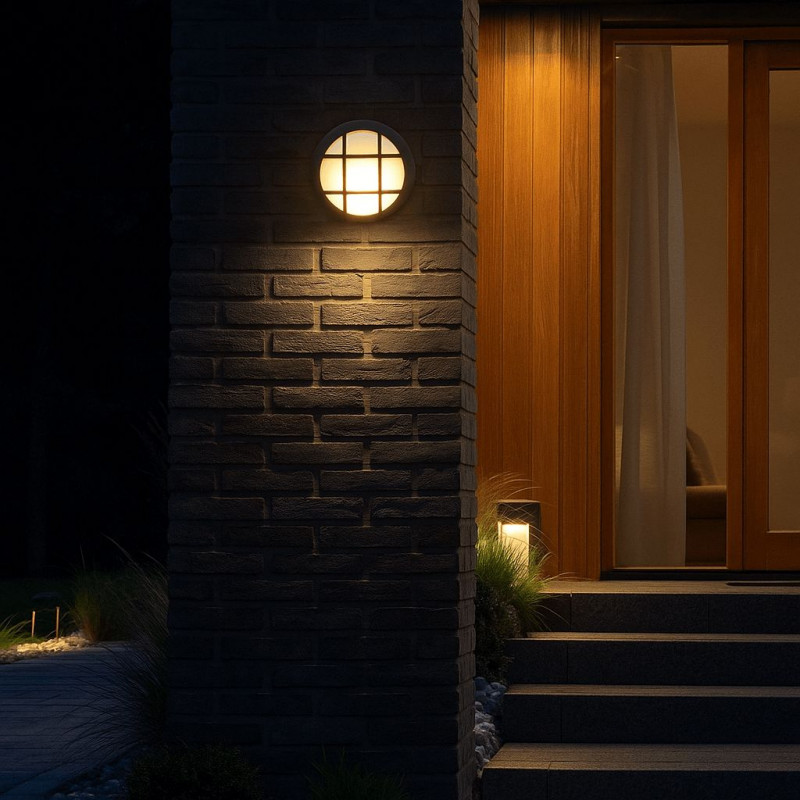 Lâmpada tipo aplique náutico com forma arredondada feita de material de resina à prova de choque, resistente à ferrugem, corrosão e aos raios UV. Coberta com uma grade decorativa. Ideal para montagem na parede e no teto. Isolamento classe II, grau de proteção IP66.