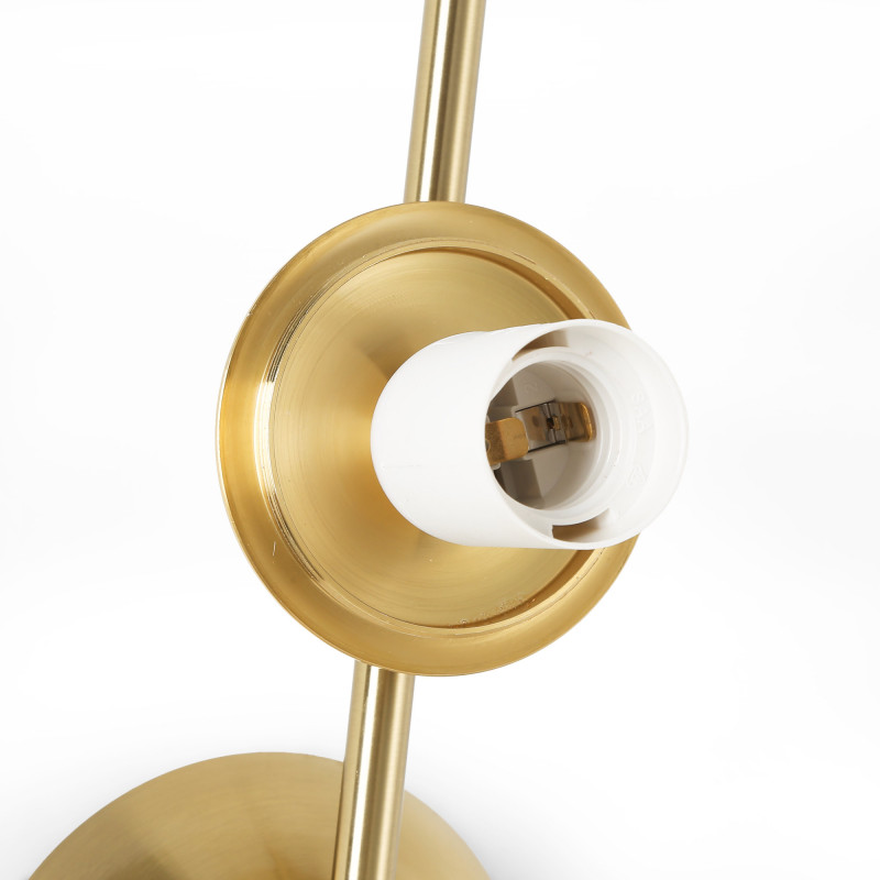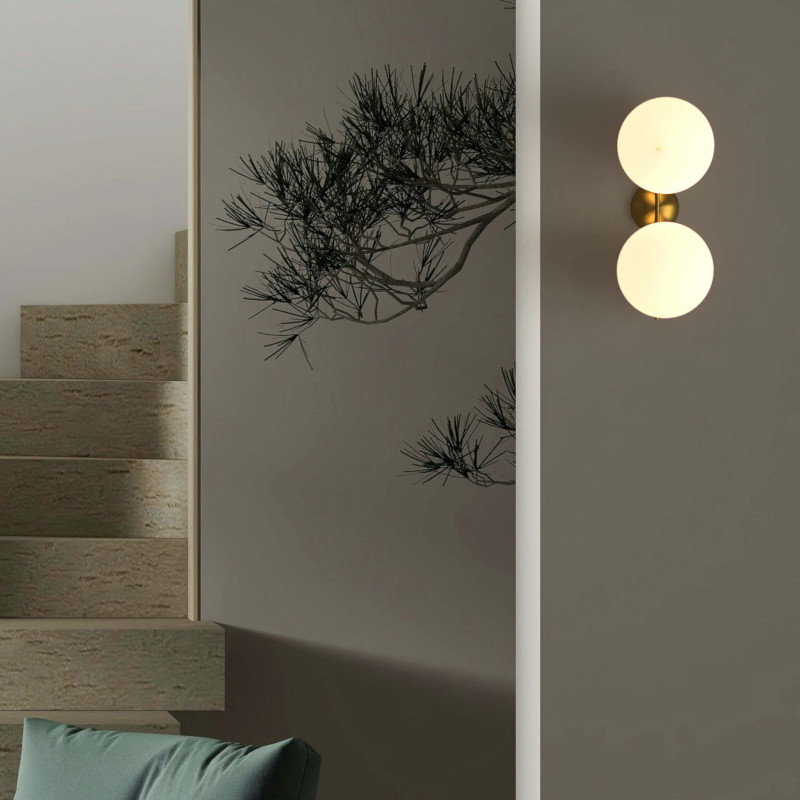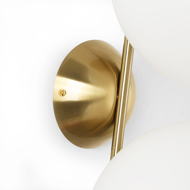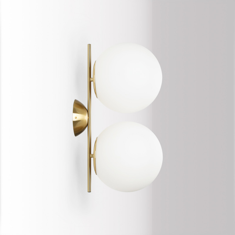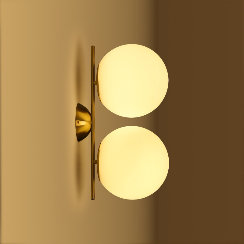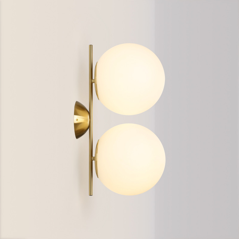 - Design minimalista: Composto por duas esferas de vidro opalino equilibradas numa estrutura de alumínio com acabamento dourado, adapta-se perfeitamente a interiores clássicos, retro ou modernos.