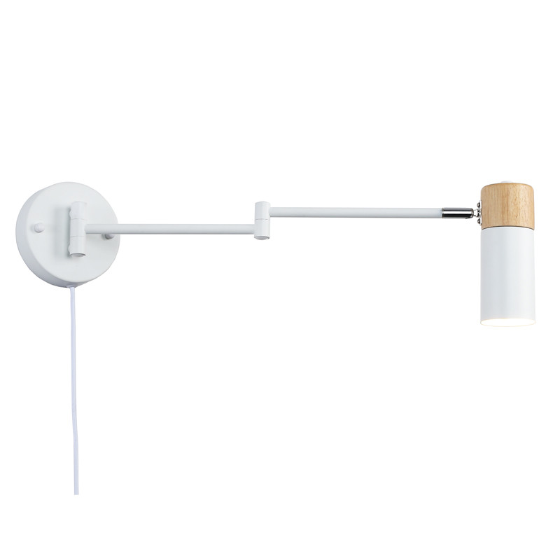 Aplique de parede extensível "LOGAN" com cabo e ficha, estilo nórdico, moderno e minimalista. Fabricado em alumínio e madeira com acabamentos de alta qualidade. Para além das suas qualidades estéticas, este candeeiro de parede oferece uma grande funcionalidade, graças aos seus braços articulados e o seu foco rotativo de 360º.