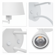 Este candeeiro de parede destaca-se pela sua dupla funcionalidade, uma vez que possui um abajur em tecido, com um casquilho E27, que permite uma iluminação geral, e incorpora simultaneamente uma luminária LED regulável especialmente concebida como candeeiro de leitura. Ambas as luminárias são ligadas ou desligadas através de interruptores independentes.