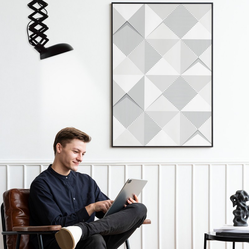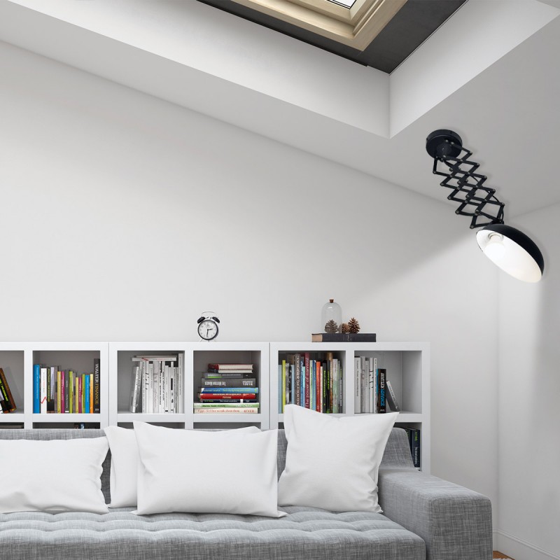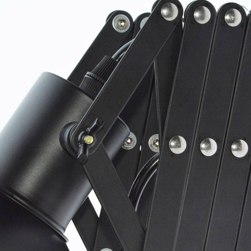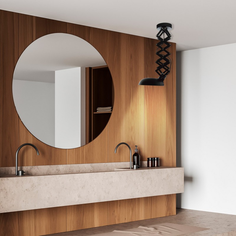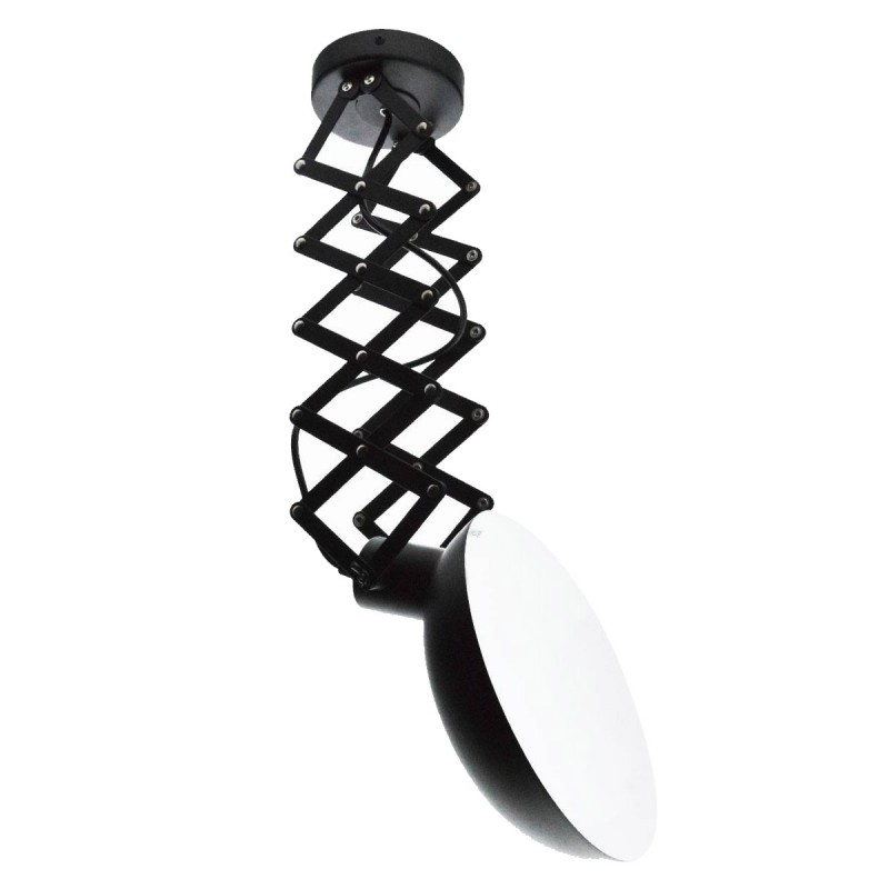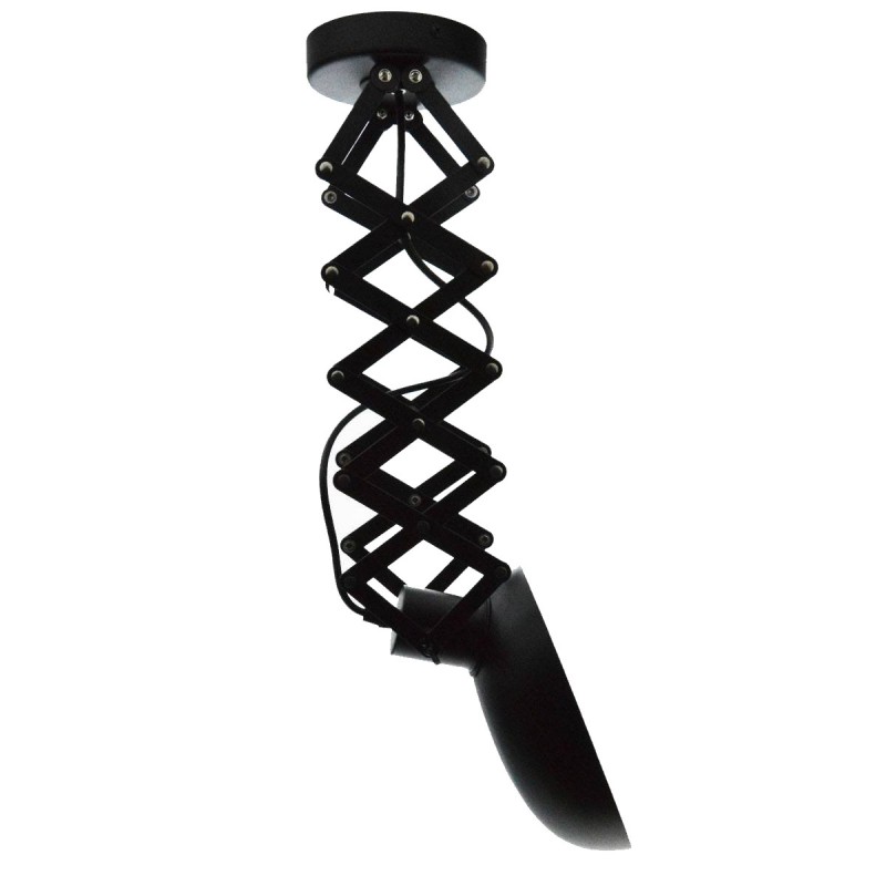 Candeeiro de teto com estrutura extensível até 62 cm e cabeça orientável, o que permite uma grande versatilidade na orientação da luz. A mola de lâmina em forma de tesoura pode ser recolhida ou estendida conforme necessário.