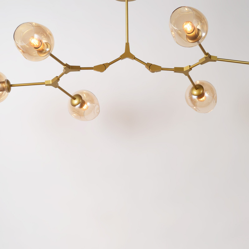 Este candeeiro suspenso destaca-se pelo seu design moderno e geométrico, perfeito para quem procura uma iluminação decorativa com carácter. A sua estrutura metálica articulada e os seis abajures em vidro conferem sofisticação a qualquer divisão, desde salas de estar e de jantar a espaços de trabalho ou comerciais.
