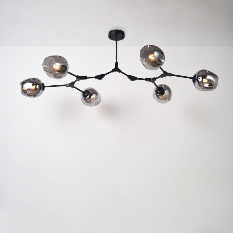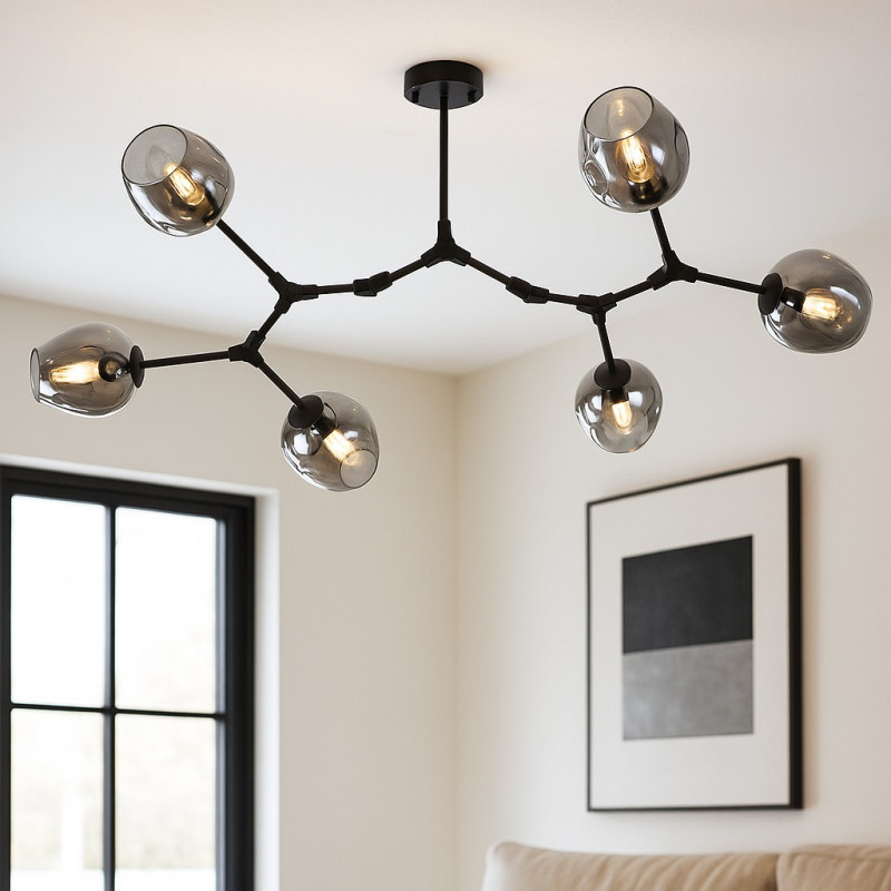 Este candeeiro suspenso destaca-se pelo seu design moderno e geométrico, perfeito para quem procura uma iluminação decorativa com carácter. A sua estrutura metálica articulada e os seis abajures em vidro conferem sofisticação a qualquer divisão, desde salas de estar e de jantar a espaços de trabalho ou comerciais.
