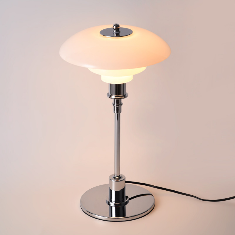 Candeeiro de mesa de design requintado com abajur em vidro opalino triplo e base em alumínio.