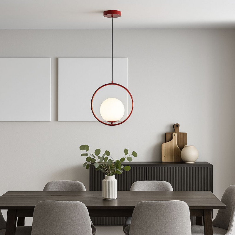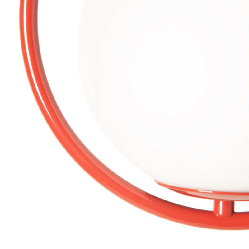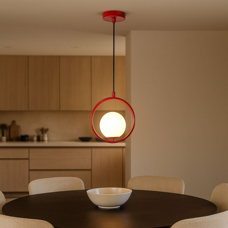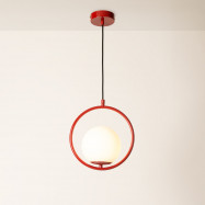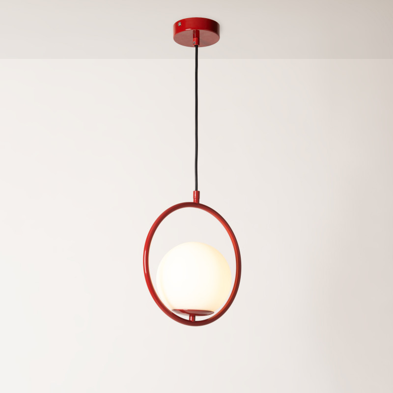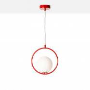 Candeeiro suspenso "Kate" composto por uma esfera de vidro opalino e uma estrutura de alumínio disponível em dourado, preto, cromado ou vermelho.