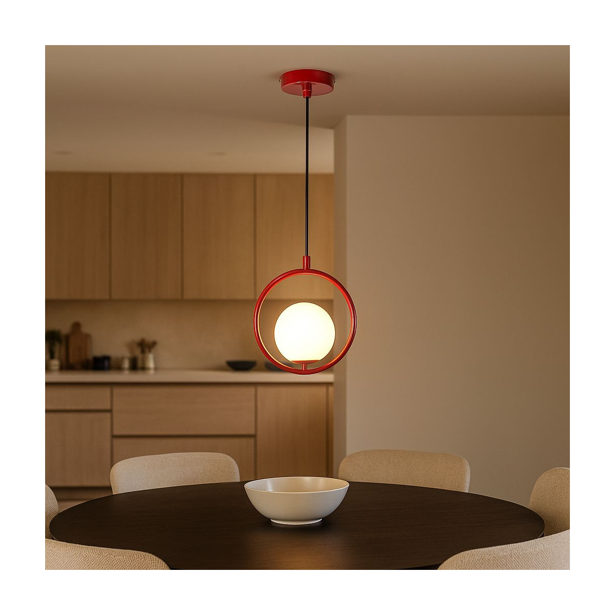 O candeeiro de suspensão "Kate" tem uma estrutura em alumínio com uma forma circular atraente, sobre a qual assenta um abajur esférico em vidro opalino com elevada transmissão de luz.