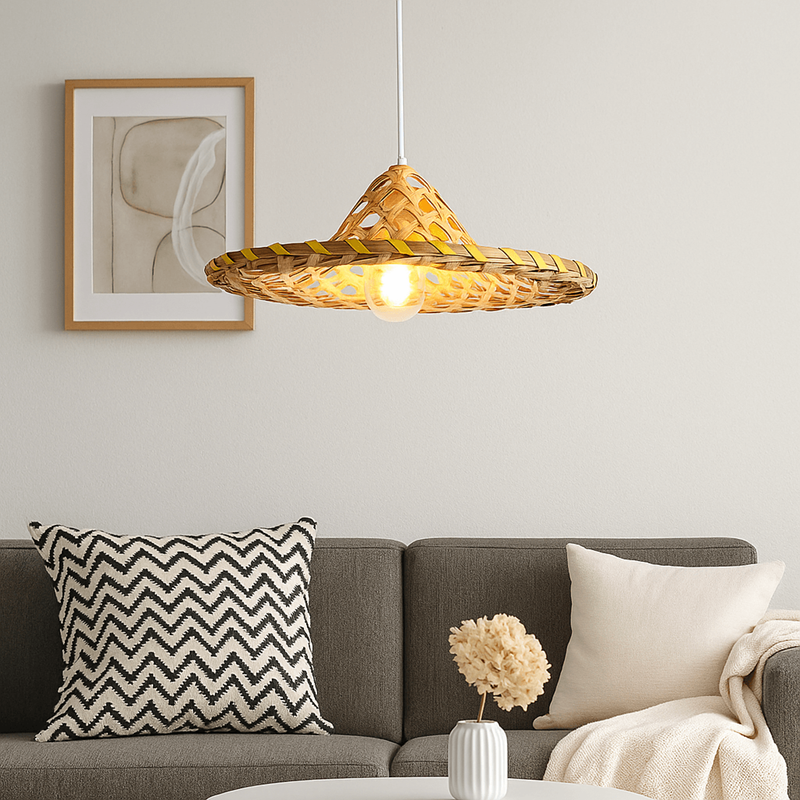 Fabricação artesanal com bambu trançado de grande resistência para uma maior durabilidade do candeeiro suspenso. Candeeiro com design de de chapéu de bambu com acabamentos de alta qualidade para oferecer uma estética artística única em qualquer ambiente interior.