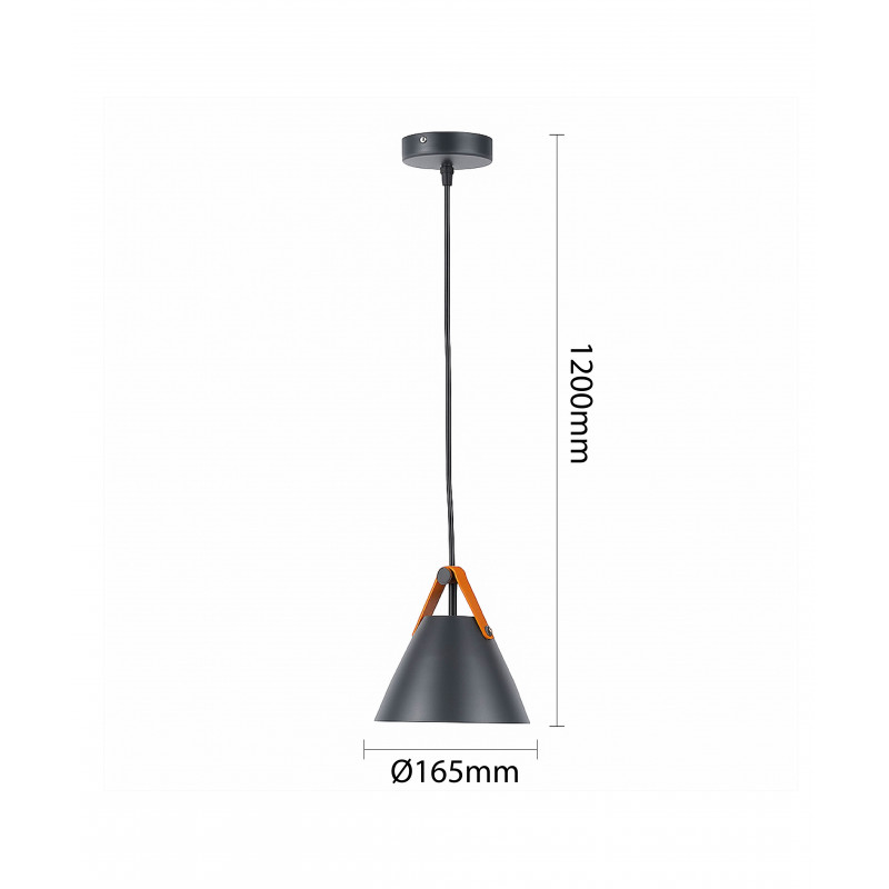 Candeeiro escandinavo que combina perfeitamente com as cores preto e branco da divisão. A tela tem dimensões reduzidas de 170mm de altura e Ø165mm de largura. A altura total da lâmpada é de 1200 mm e pode ser ajustada através da rosa do teto.
