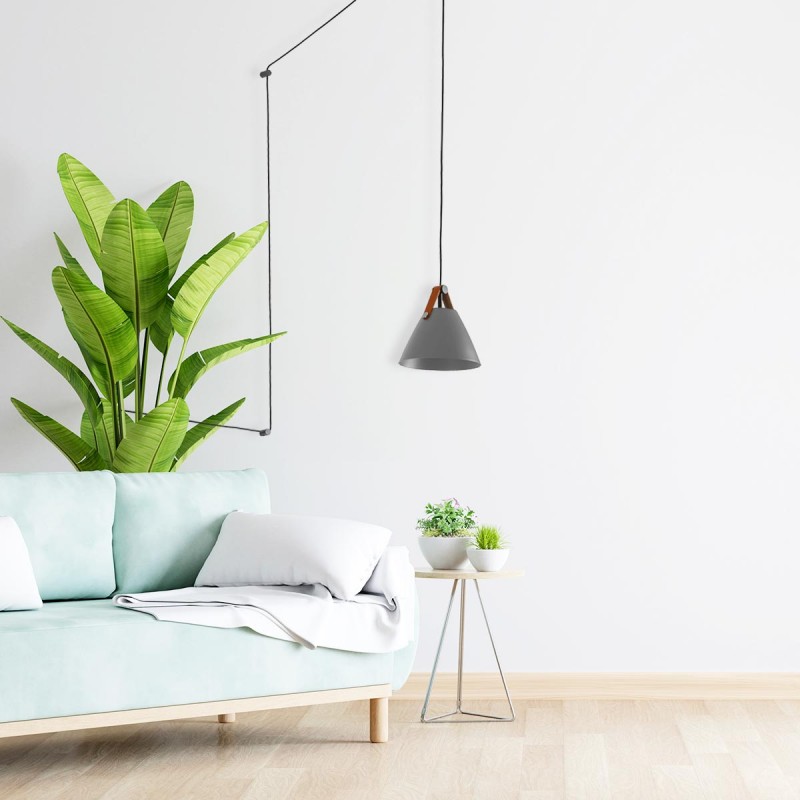 Candeeiro nórdico e moderno que combina perfeitamente com as cores preto e branco da divisão. A tela tem dimensões reduzidas de 170 mm de altura e Ø165 mm de largura. A altura total da lâmpada é de 4000 mm e pode ser ajustada através da rosa do teto.