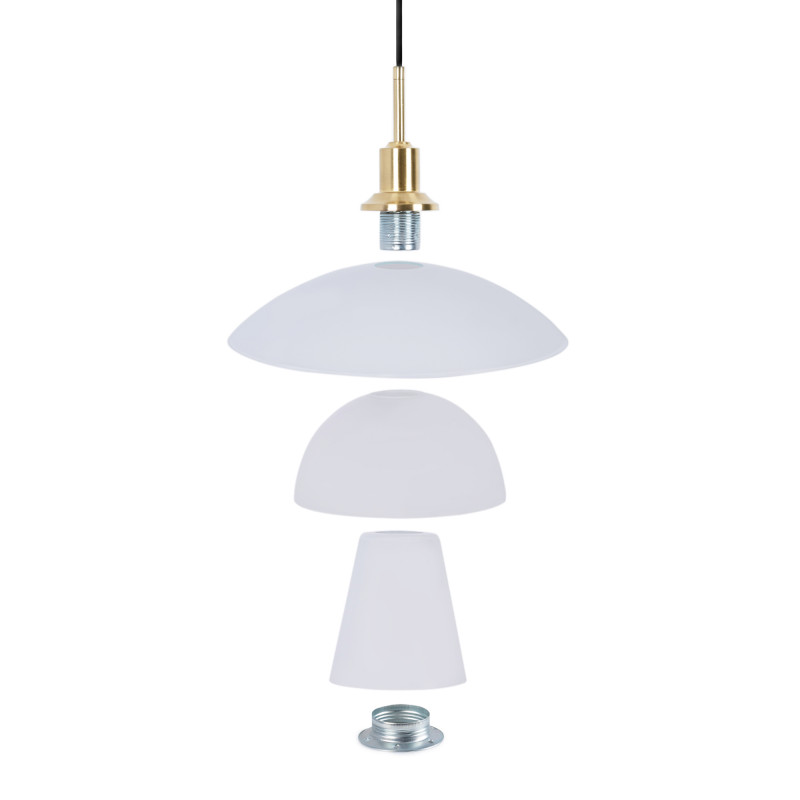 O seu design baseia-se num sistema de três abajures reflectores que direcionam a luz para baixo. Os abajures são feitos de vidro opalino e estão posicionados a uma distância exacta uns dos outros para proporcionar uma iluminação suave, difusa e sem reflexos.