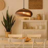 Candeeiro suspenso com um design de linhas fluidas que gera um efeito visual envolvente. Perfeito para espaços que procuram uma estética moderna, ecológica e com carácter.