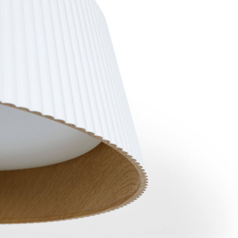 Este candeeiro de teto, disponível nos acabamentos branco ou preto, apresenta um design inovador que mistura policarbonato com um interior em tom de madeira e um difusor central em policarbonato.
