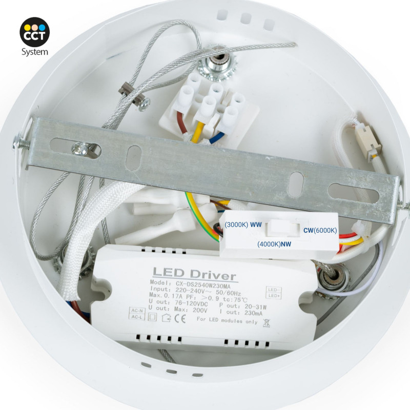 Além disso, devido ao seu sistema CCT, pode ajustar a temperatura da luz de acordo com as suas preferências: quente (3000K), neutra (4000K) ou fria (6000K). Crie o ambiente perfeito para cada ocasião de forma simples através de um interrutor interno!