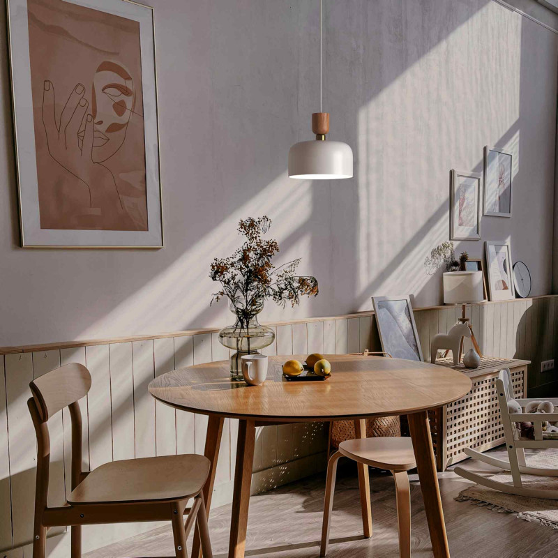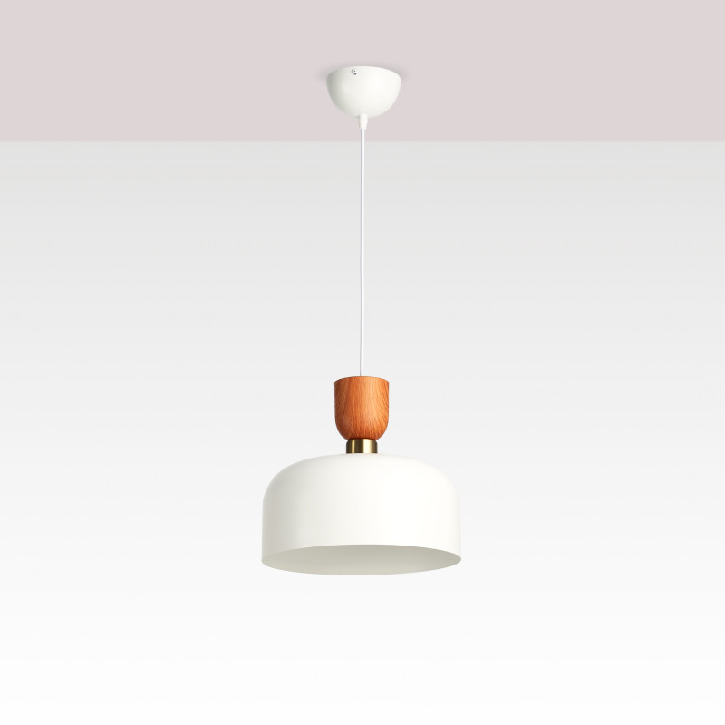 O candeeiro suspenso "Franz" combina um abajur de metal com detalhes dourados e efeito de madeira natural, oferecendo uma estética elegante e minimalista. Perfeito para dar um toque distinto a qualquer espaço.