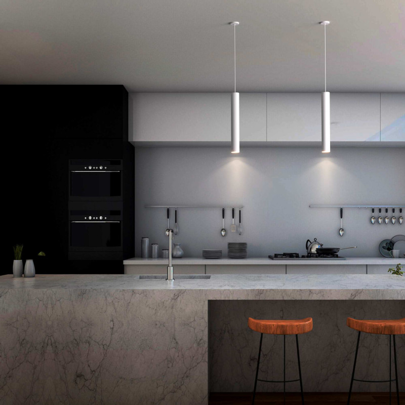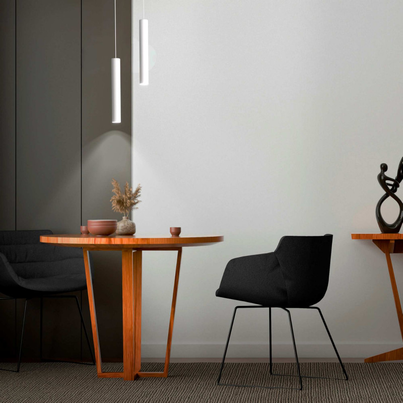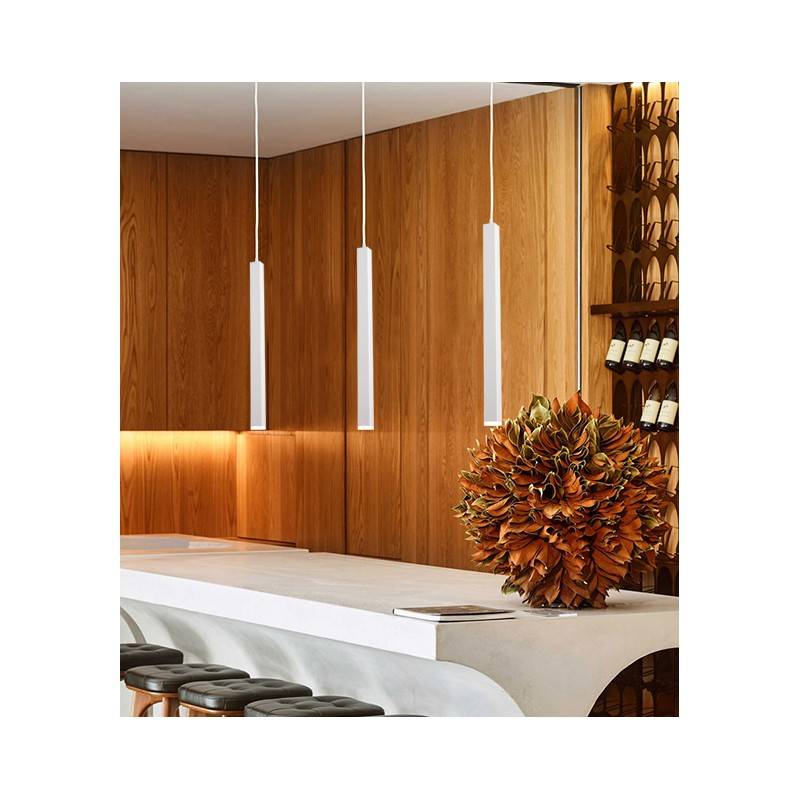 O candeeiro suspenso "Tub" tem um design moderno e minimalista em forma de tubo e é perfeito para iluminação focada em áreas específicas, como mesas, bares e cozinhas.