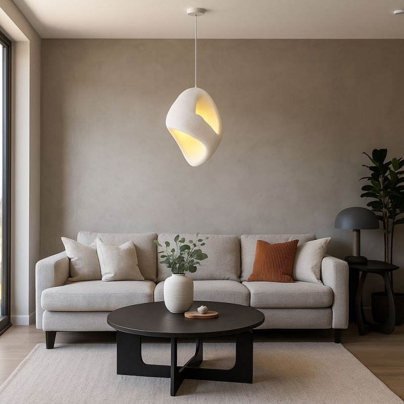 Candeeiro suspenso feito de resina com um acabamento branco texturado. Uma peça única que transmite calor e carácter orgânico.