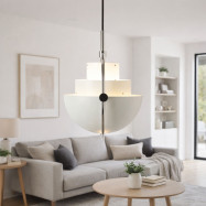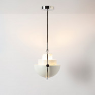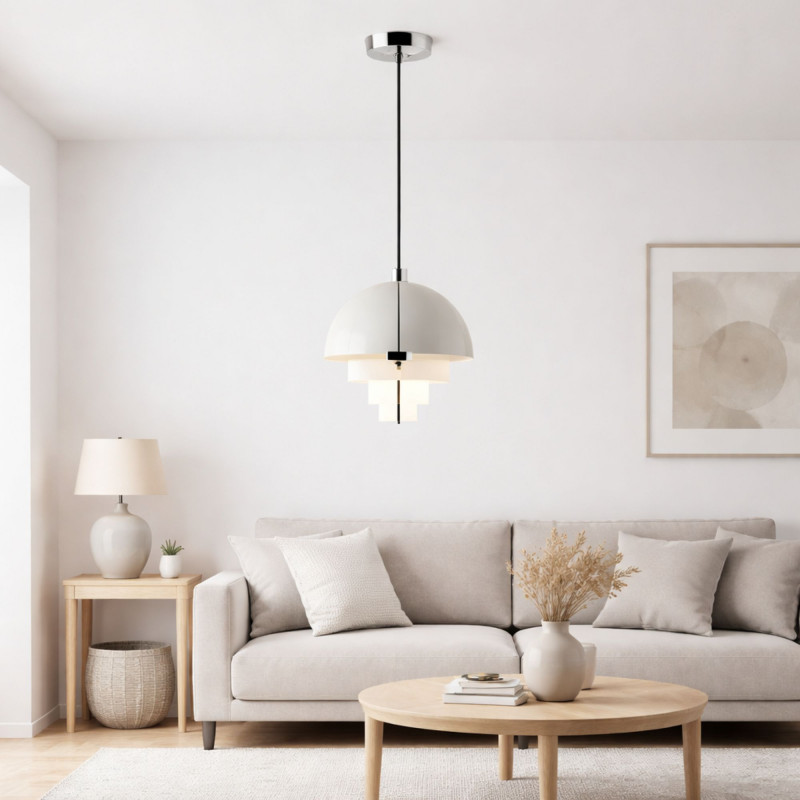 - Design único: Dois abajures hemisféricos suportados por um anel metálico permitem direcionar a luz para cima, para baixo ou em ângulos personalizados, criando um efeito decorativo assimétrico.