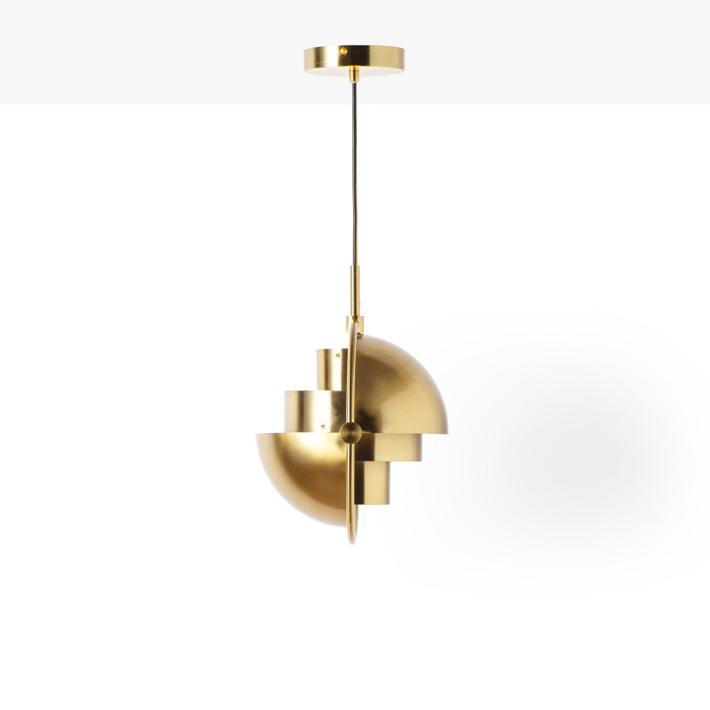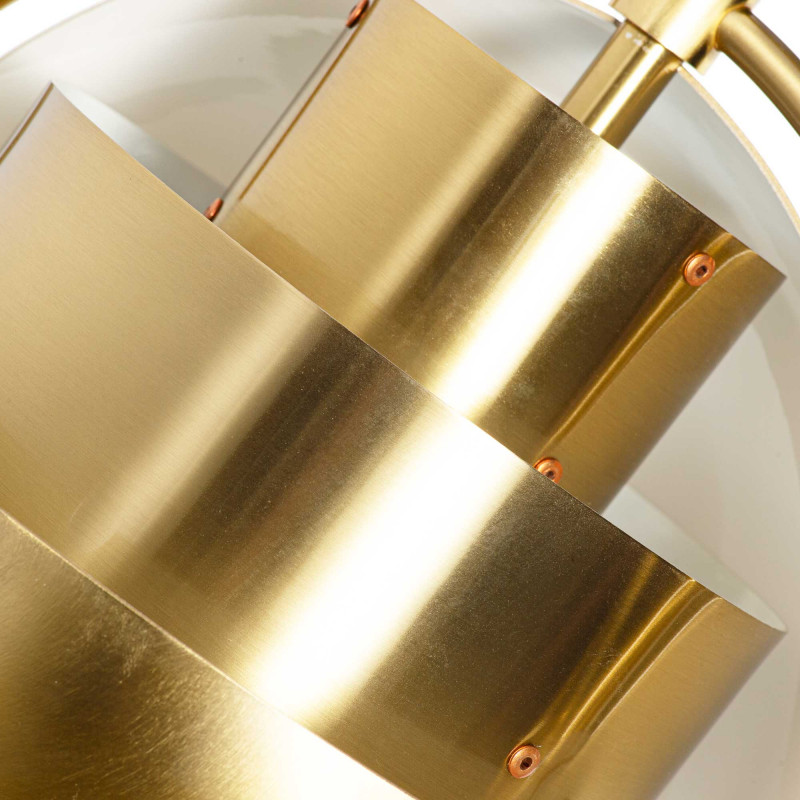 - Design único: Dois abajures hemisféricos suportados por um anel metálico permitem direcionar a luz para cima, para baixo ou em ângulos personalizados, criando um efeito decorativo assimétrico.