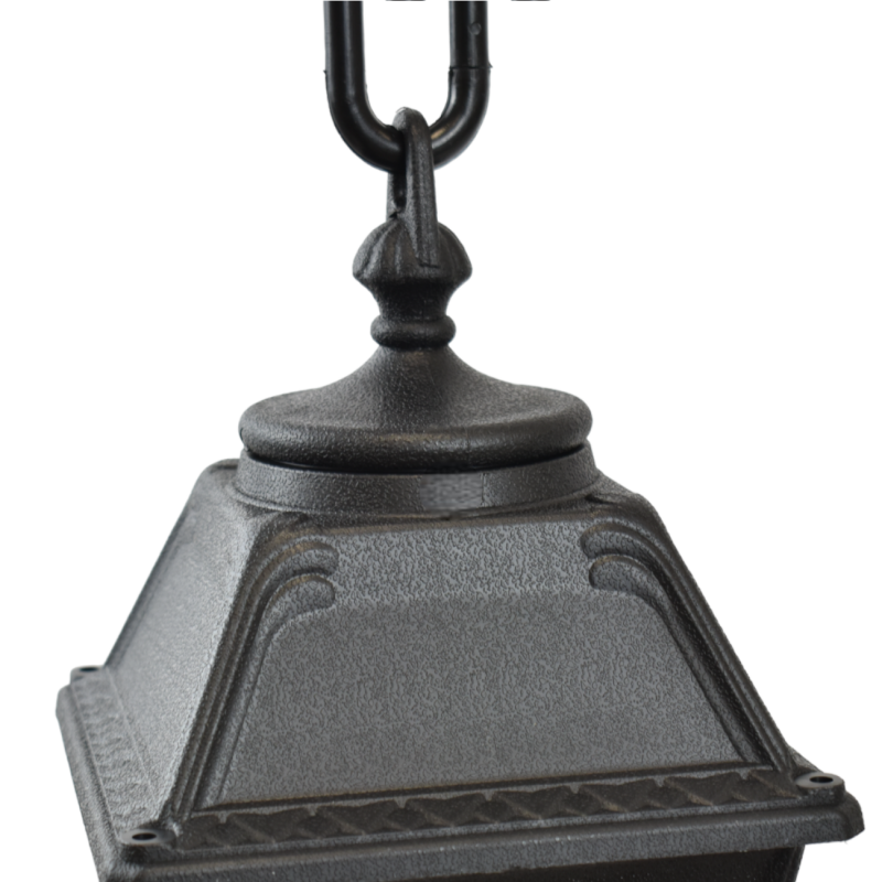 O candeeiro do tipo farol pendente tem um desenho clássico e grau de proteção IP55, tornando-o adequado para instalação em tetos exteriores, sendo resistente a fatores externos, tais como poeira e humidade.
