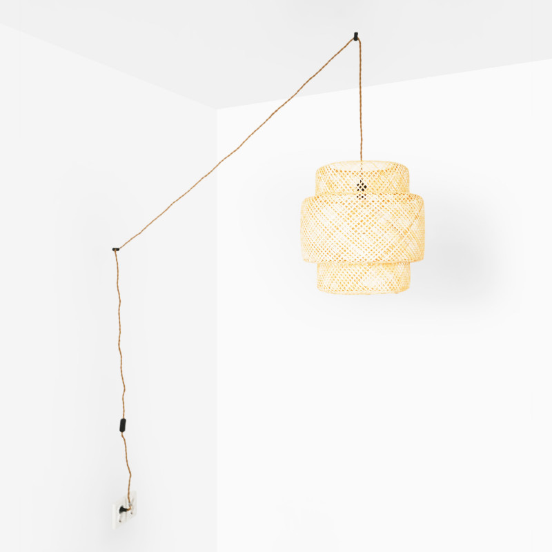 • Instalação flexível: Inclui cabo ajustável com dois ganchos descentralizadores para diferentes configurações. Inclui interrutor e tomada Schuko, ideal para espaços sem um ponto de luz próximo. Disponível em preto, branco e corda natural.