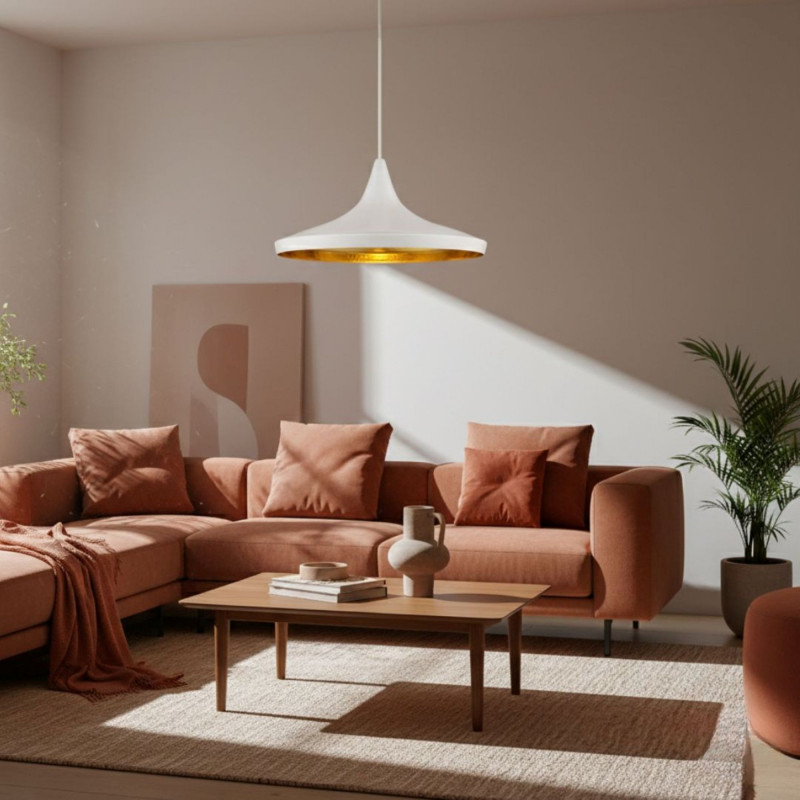 Pode ser equipado com uma lâmpada LED E27 (não incluída) e tem um cabo de 115 cm, regulável em altura a partir da roseta.