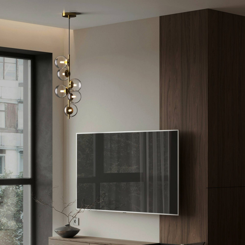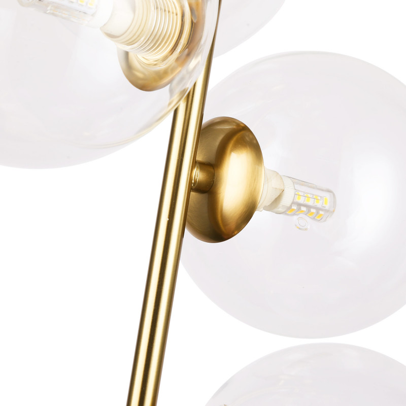 - Design elegante: Composto por 6 esferas de vidro transparente e uma estrutura central dourada, este candeeiro adapta-se a diferentes estilos decorativos.
