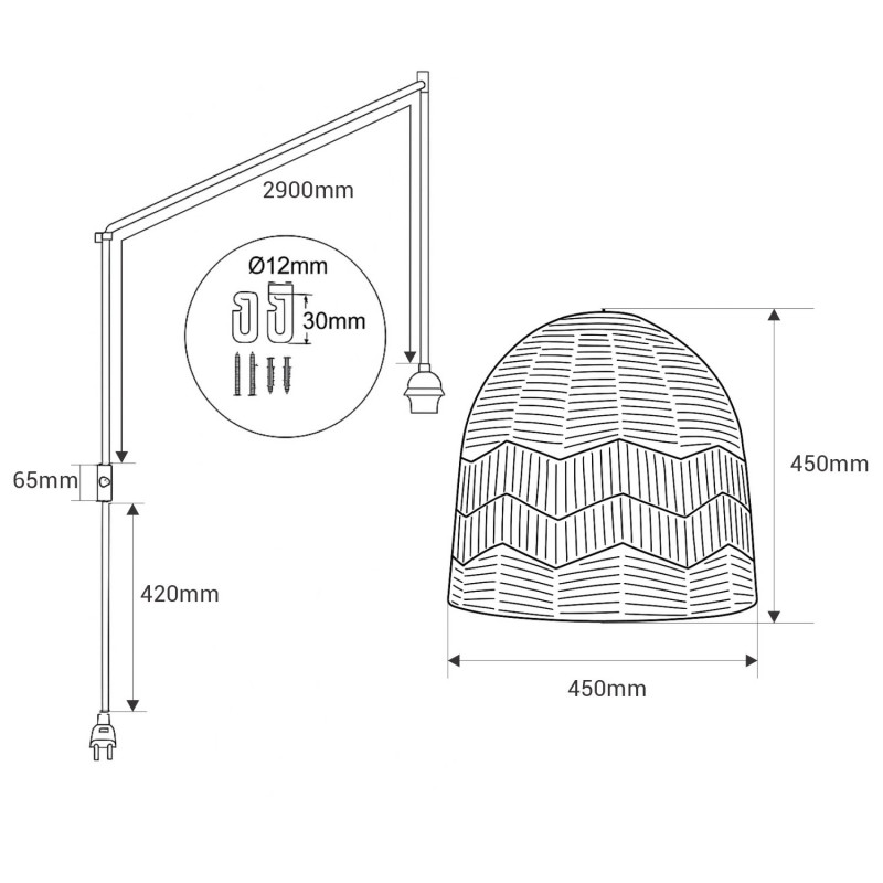 • Instalação flexível: Inclui cabo ajustável com dois ganchos descentralizadores para diferentes configurações. Inclui interrutor e tomada Schuko, ideal para espaços sem um ponto de luz próximo. Disponível em preto, branco e corda natural.