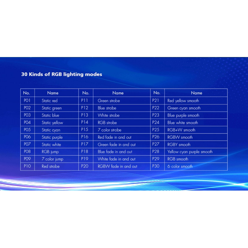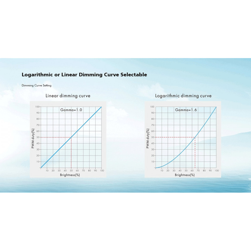 Oferece modos de descodificação de 1 a 4 canais e várias frequências PWM. Permite selecionar entre níveis de cinza de 8 ou 16 bits e ajustar a curva de atenuação. Inclui modos de regulação RGB autónomos e de 4 canais que podem ser controlados através de botões incorporados com programas predefinidos, permitindo o funcionamento sem a necessidade de um sinal DMX externo.