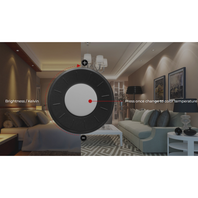 Possibilita regular tanto a intensidade como a temperatura da cor utilizando o botão giratório. Se o botão do centro for pressionado uma vez, dá a opção de mudar a cor da temperatura e com o círculo se regula a tonalidade em graus Kelvin.