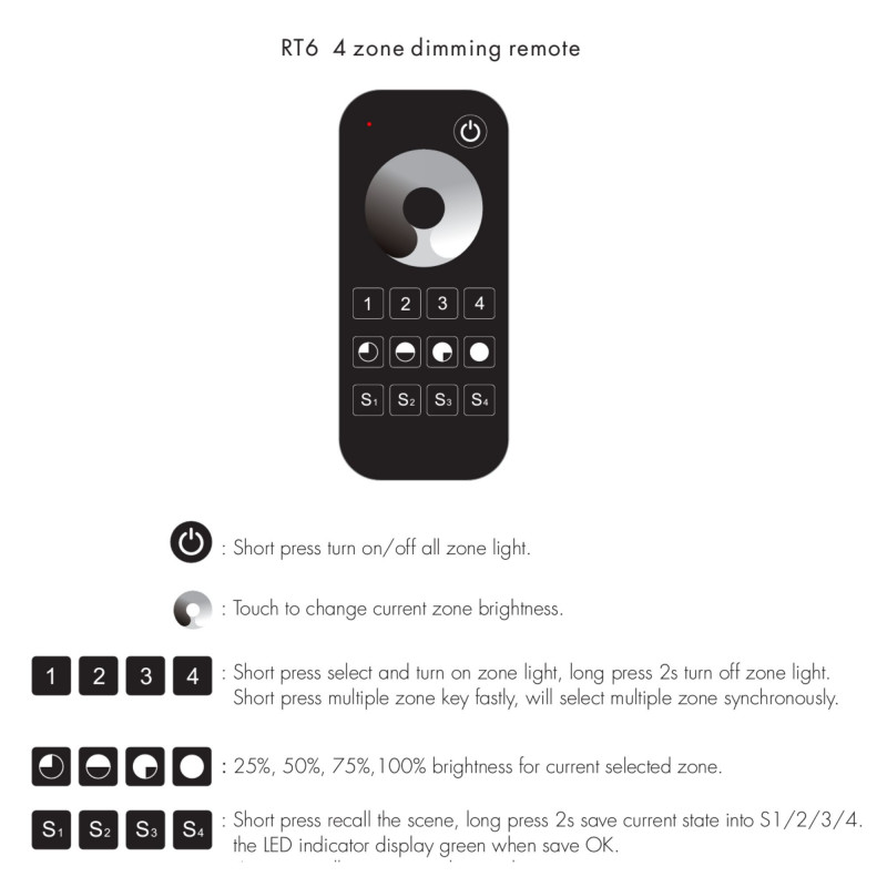 Pode controlar até quatro áreas diferentes e criar grupos e combinações conforme necessário. É necessário um controlador "Skydance" para cada zona a ser controlada. Por outras palavras, para controlar 4 zonas de forma independente, são necessários 4 controladores e um controlo remoto.
