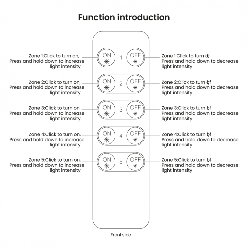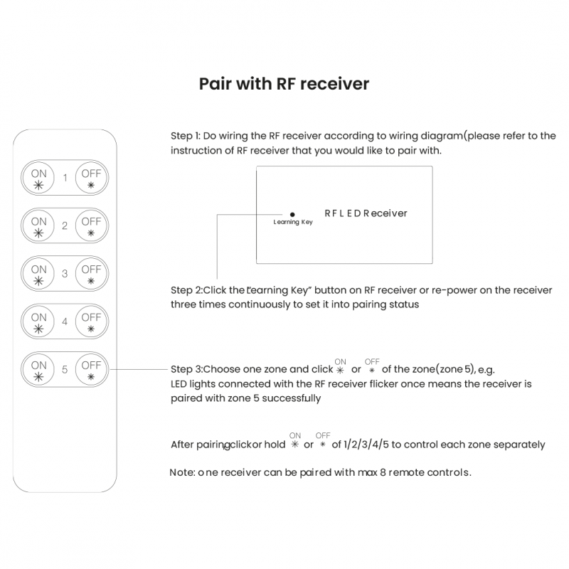 É um controlador LED unicolor que oferece tanto funções de ligar/desligar como de suavizar a luminosidade. Concebido com uma interface de fácil utilização, o regulador de luminosidade pode ajustar o brilho com rapidez, precisão e suavidade sem qualquer cintilação. Cada controlador pode controlar 5 zonas diferentes separadamente com receptores infinitos em cada zona. O suave escurecimento varia de 0,1% a 100% sem qualquer cintilação é realmente bom para os olhos humanos. A função de memória humanizada permite ao controlador remoto recordar o último brilho após o desligamento ou corte.