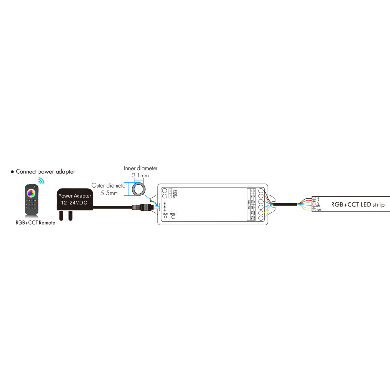 - Compatibilidade: Compatível com tiras de LED RGB + CCT de 12-24V.
