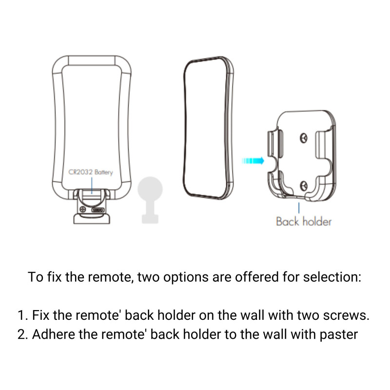 Inclui um suporte que se instala na parede através de dois parafusos, ou pode ser fixado com cola.