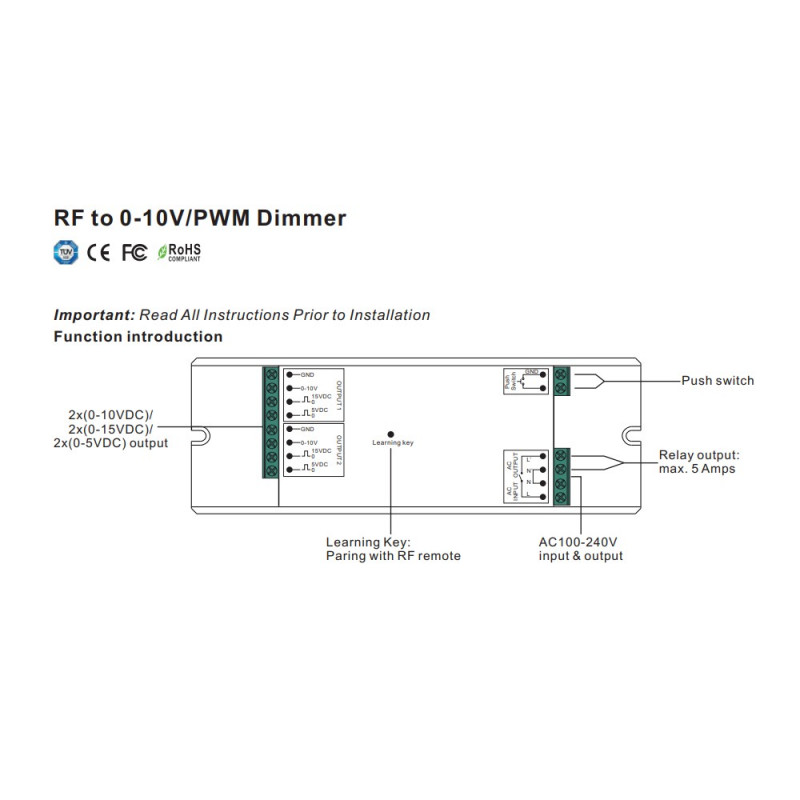 O conversor RF para 0-10V da Sunricher é um dispositivo concebido para transformar sinais de radiofrequência (RF) em sinais de driver de tensão 0-10V/PWM, fornecendo assim uma solução eficiente para o controlo de luzes LED de uma só cor.
