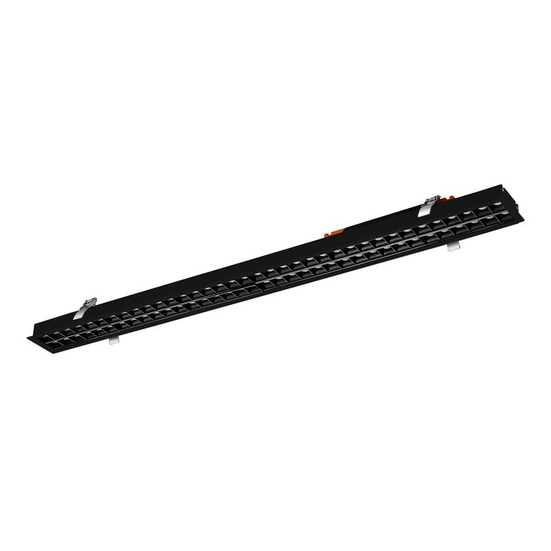Luminária LED Linear encastrável 40W Chip Osram e índice de reflexo ideal (UGR <18). Disponível com acabamentos de elevada qualidade em branco ou preto. Chip Osram altamente eficiente, reprodução de cor (CRI> 85), alta intensidade de luz de 4400lm e temperatura de cor quente de 2700ºK.