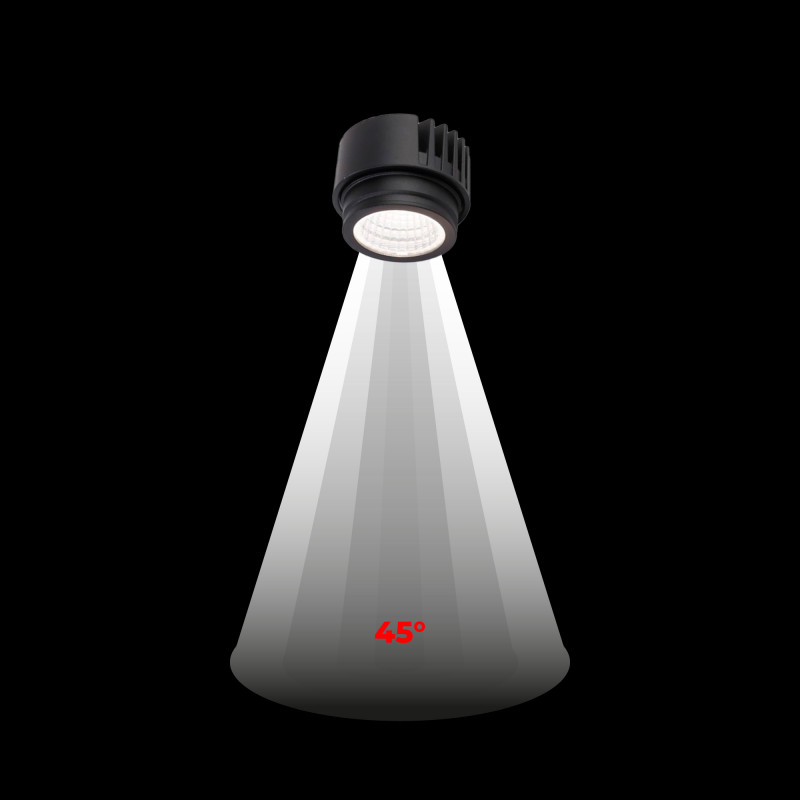 - Iluminação focada: Com um ângulo de abertura de 45º, oferece uma iluminação focada, ideal para destacar vitrinas, montras ou zonas específicas.