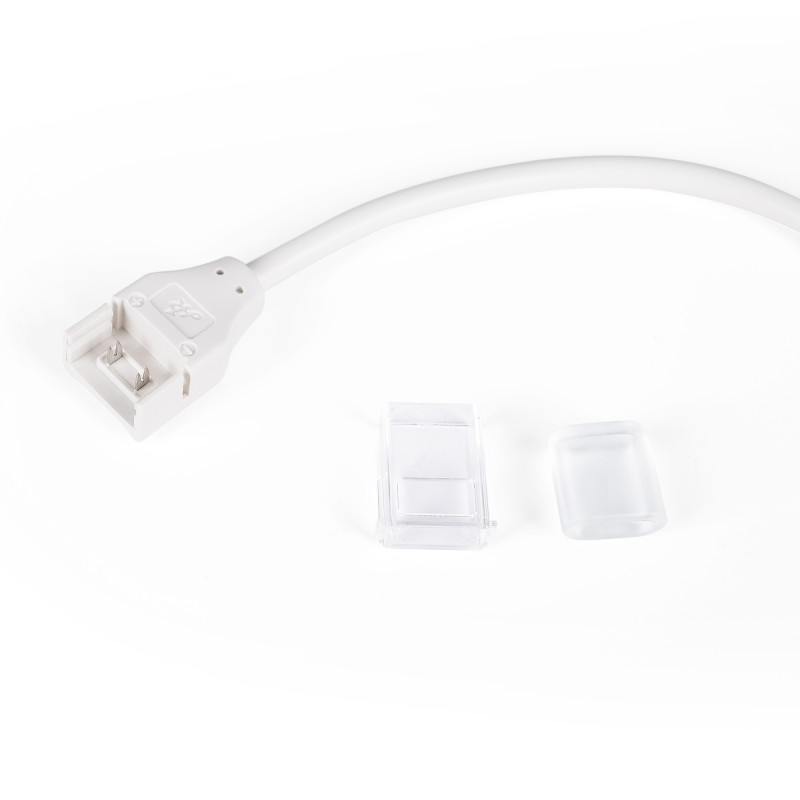 Este conjunto inclui um conetor de início e um tampão de extremidade concebidos para tiras de LED de 10mm com proteção IP65. O conetor permite uma ligação rápida e segura, enquanto a tampa da extremidade, aplicada com silicone térmico, veda a extremidade para evitar fugas de humidade ou poeiras.