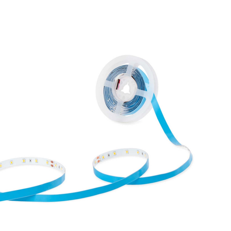 A fita LED é fornecida num rolo de 5 metros. Os cortes podem ser realizados a cada 10 cm, de acordo com as marcações indicadas. A largura da fita é de 10 mm e possui um adesivo no verso para a colar à superfície desejada.