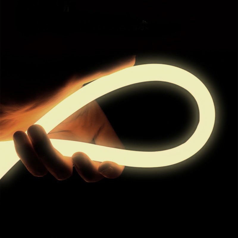 O Neon LED flexível apresenta uma cobertura de silicone, com acabamento opalina, que espalha a luz de forma semelhante aos antigos letreiros de néon.