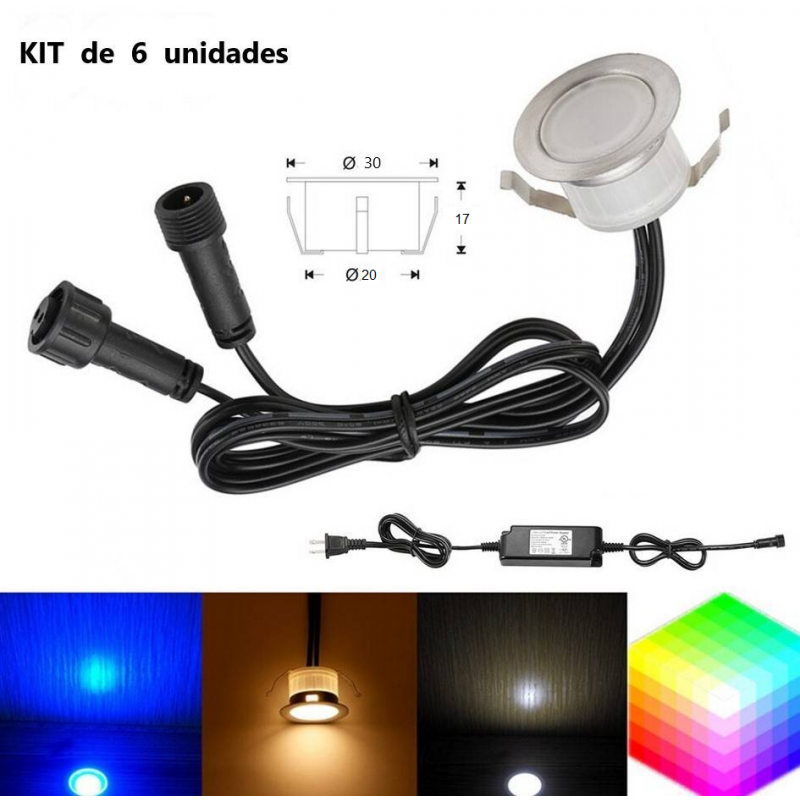 O KIT de luzes LED de chão consiste de uma fonte de alimentação de 8 Watt, 6 luzes de solo e todos os cabos necessários para a instalação. O comprimento do cabo entre 2 pontos de luz é de 1 metro.